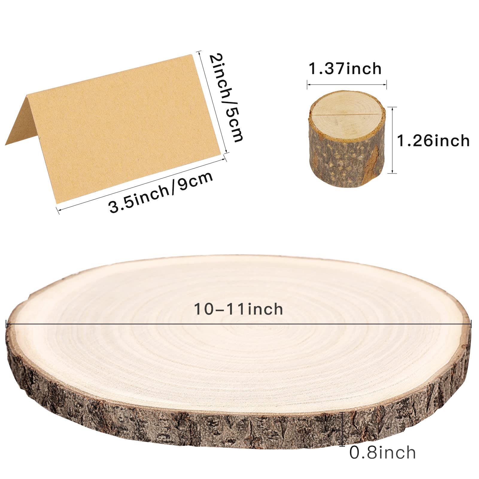 Natural Wood Slices Pack: You will receive 8 pieces of natural wood slices with bark, 8pcs wood table number holders, and 8pcs cards, a appropriate quantity set for small gatherings@Large Size(approx.): The diameter of wood slab measures 10inch - 11inch. Thickness is 0.8inch. The table card holders are 1.26 inch in tall. Round wood slices and wood table number holder are unique and natural which will vary slightly in size and shape@Quality Material: The round wood slice for centerpiece is made of paulownia and still have the bark attached, lightweight and easy to take, can be used for a long time(Note: Some of the wood chips are not great round, incline to oval shape)@Table Number Cards & Holder: Not only can hold cards as table number sign, but also as the cake stand. The wooden table number stand is convenient to show and instruct your guests the information or table number@Multi-purpose: The wood chips can be used for crafts, decor, country wedding decor, wedding centerpieces, cake stands, carvings, arts, woodworking, holidays party decor, cabin, plate coasters, table mat, home decor, crafts and DIY supplies