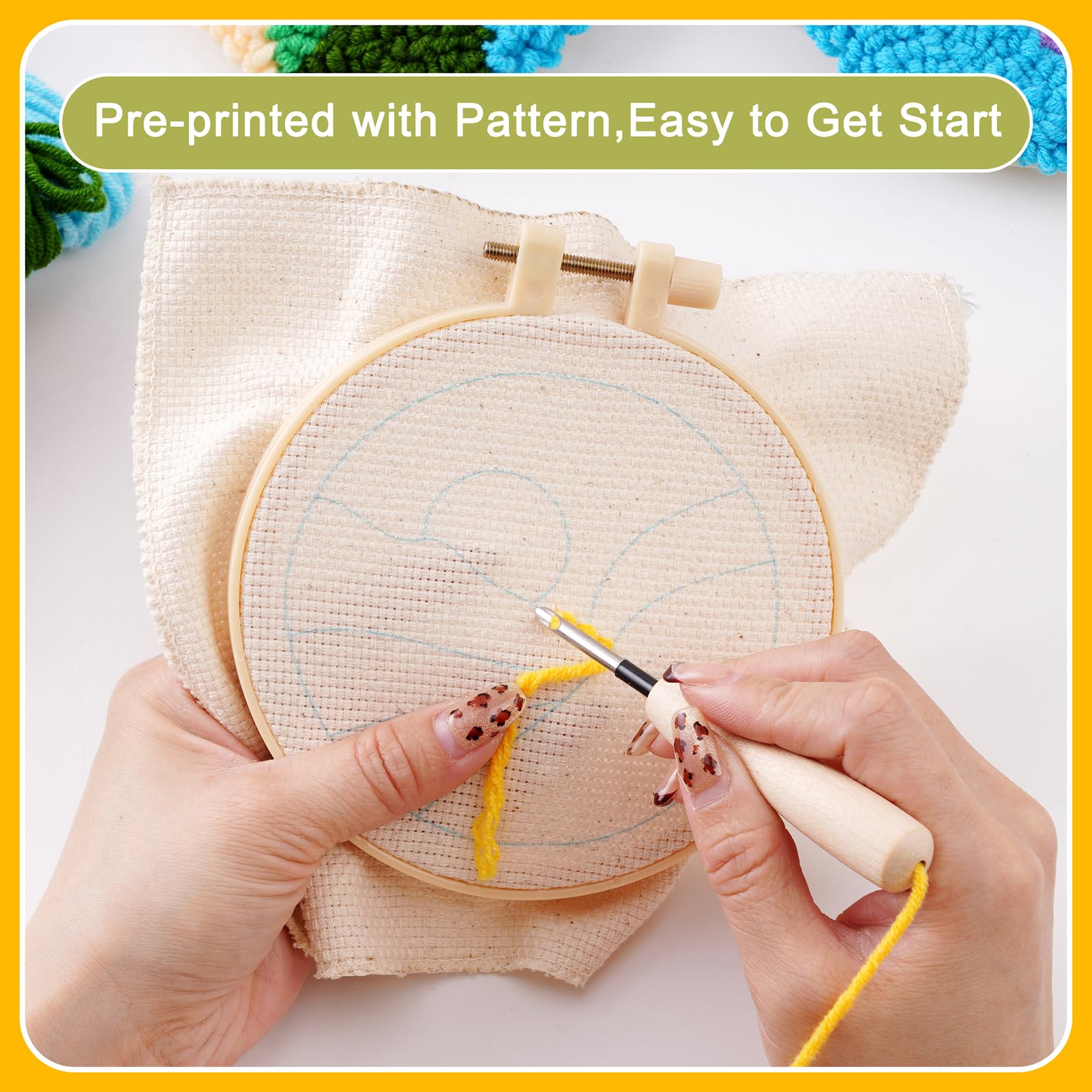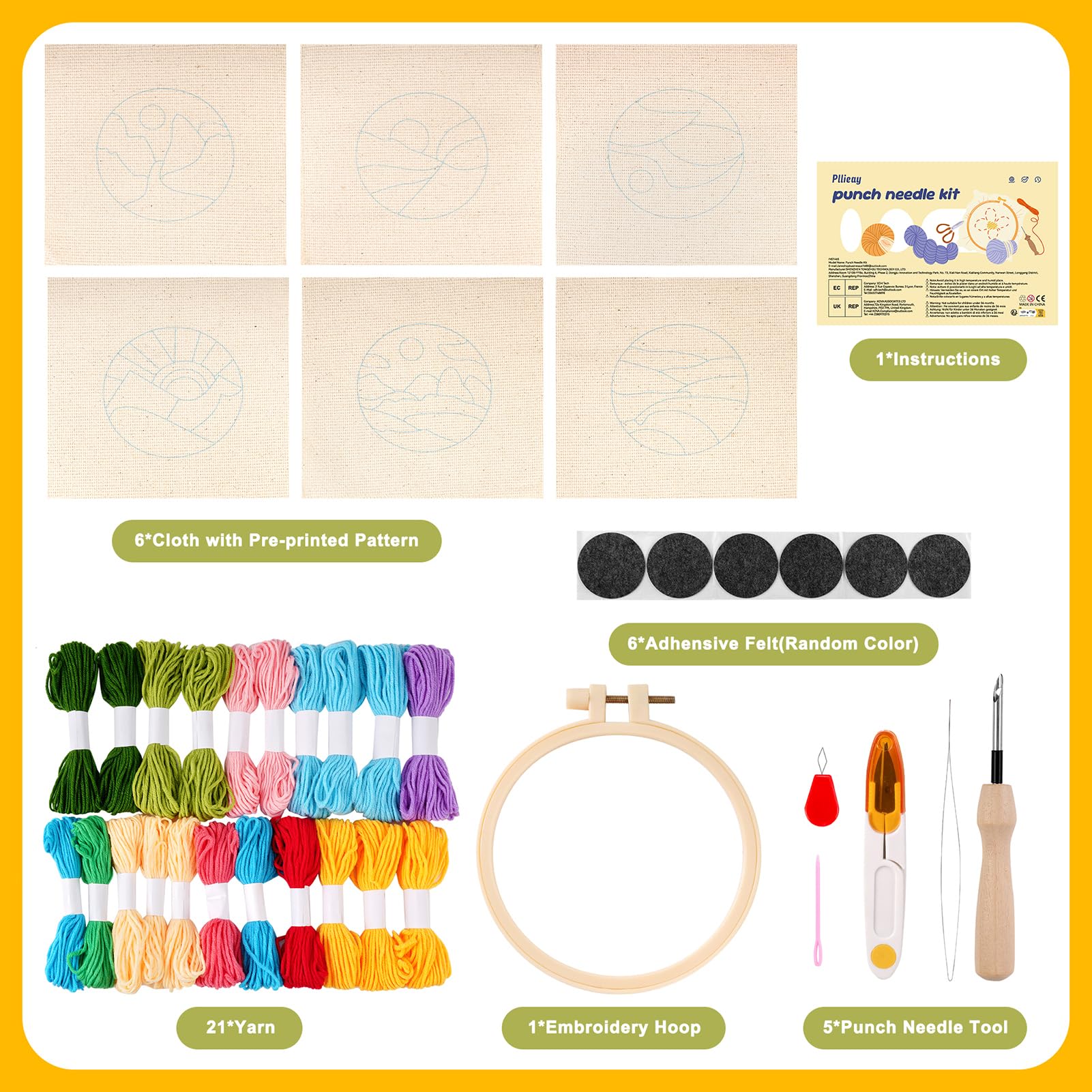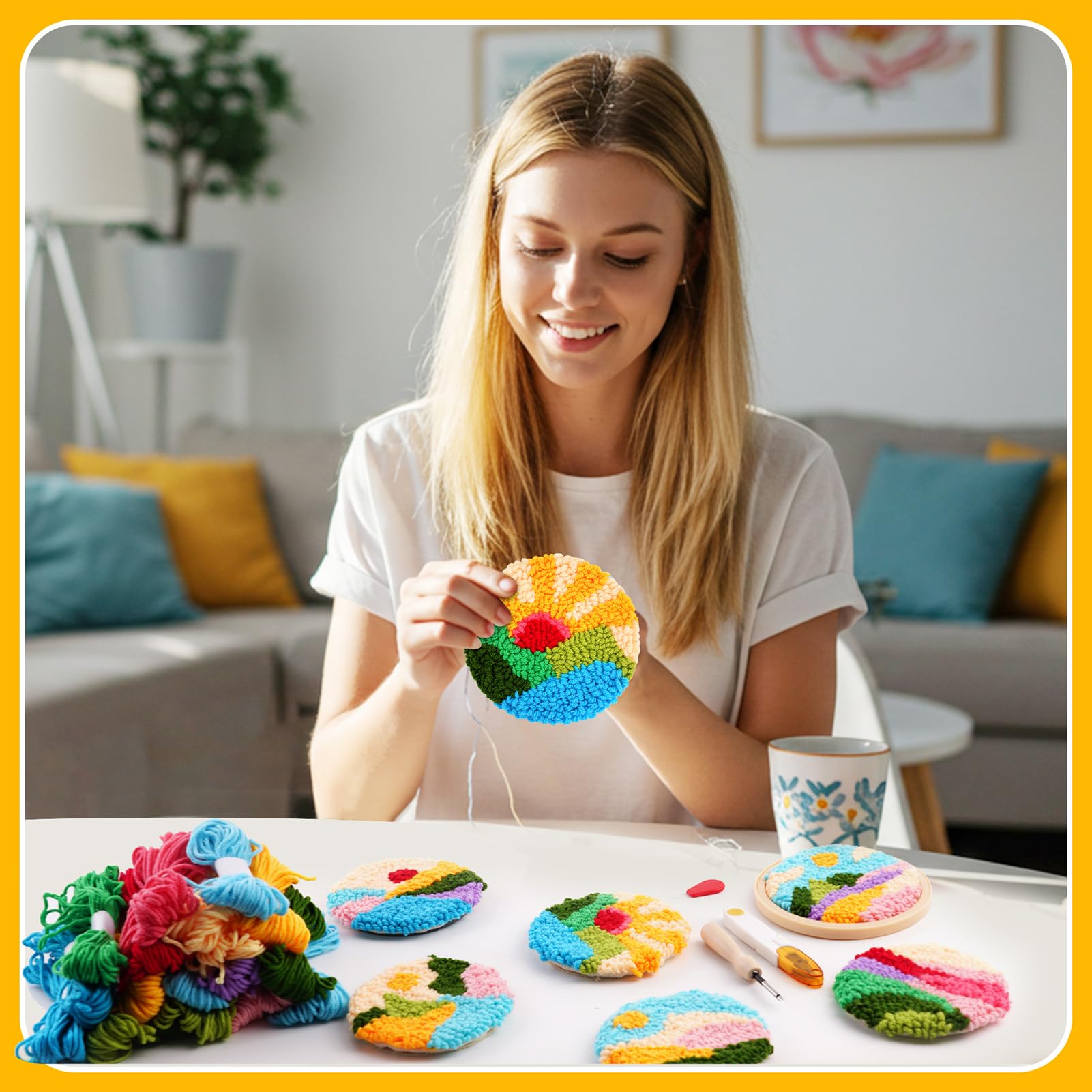 Package Includes: Including 6pc cotton cloth with pattern, 1pc embroidery hoop(4.7inch/ 12CM), 11 Colors Yarn, , 6 adhesive felt, 1 set of embroidery tools and instructions@Sunrise Theme Design: The punch needle coasters kit features a vibrant sunrise theme with simple patterns and rich, vivid colors. This design not only adds a splash of color to any setting but also provides an engaging and enjoyable crafting experience@Pre-Cut Convenience: Each kit includes pre-printed patterns on fabric and pre-cut felt pieces, eliminating the need for additional cutting, which is convenient for beginners, allowing them to focus on the creative process without extra preparation@Child-Friendly Crafting: With its simple and easy-to-follow patterns, this kit is suitable for children. It offers an opportunity to create coasters together, fostering hand-eye coordination and patience in young crafters while spending quality time with family@Versatile Usages: This punch needle coaster kit is not only practical for protecting tables but can also be given as a gift to friends, providing them with a delightful and creative project to enjoy